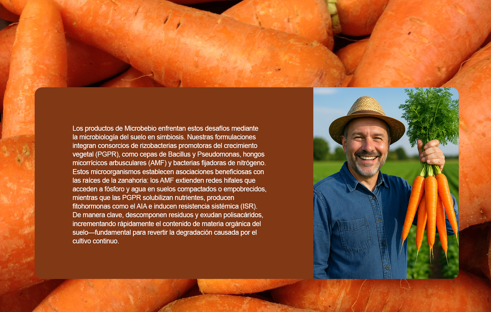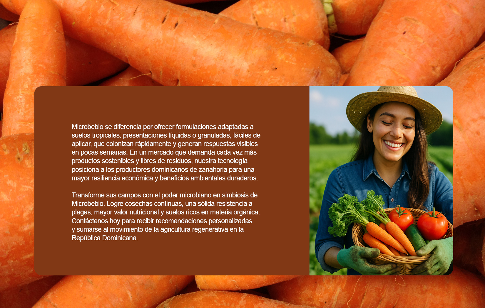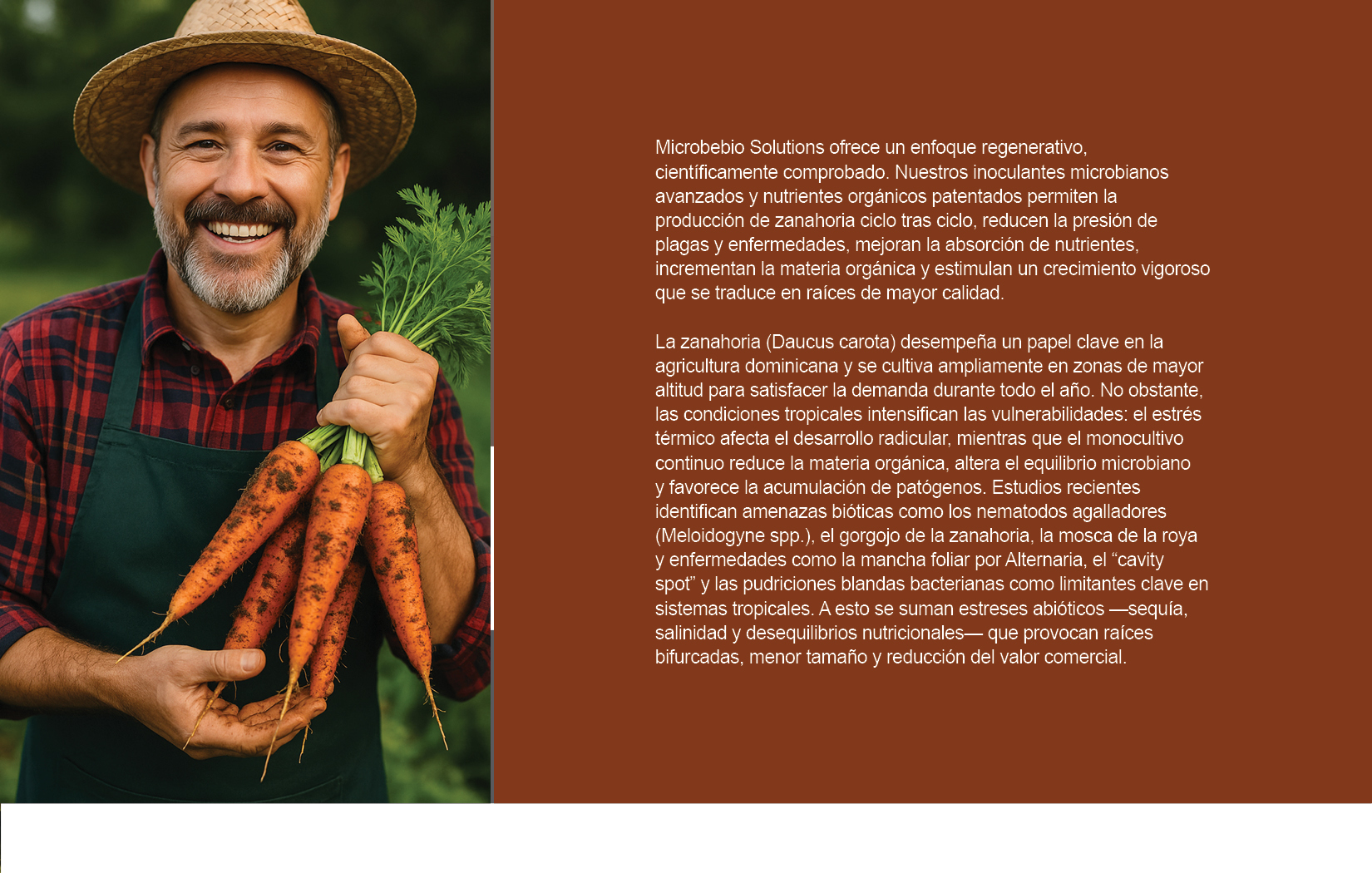 Microbebio se diferencia por ofrecer formulaciones adaptadas a suelos tropicales: presentaciones líquidas o granuladas, fáciles de aplicar, que colonizan rápidamente y generan respuestas visibles en pocas semanas. En un mercado que demanda cada vez más productos sostenibles y libres de residuos, nuestra tecnología posiciona a los productores dominicanos de zanahoria para una mayor resiliencia económica y beneficios ambientales duraderos.