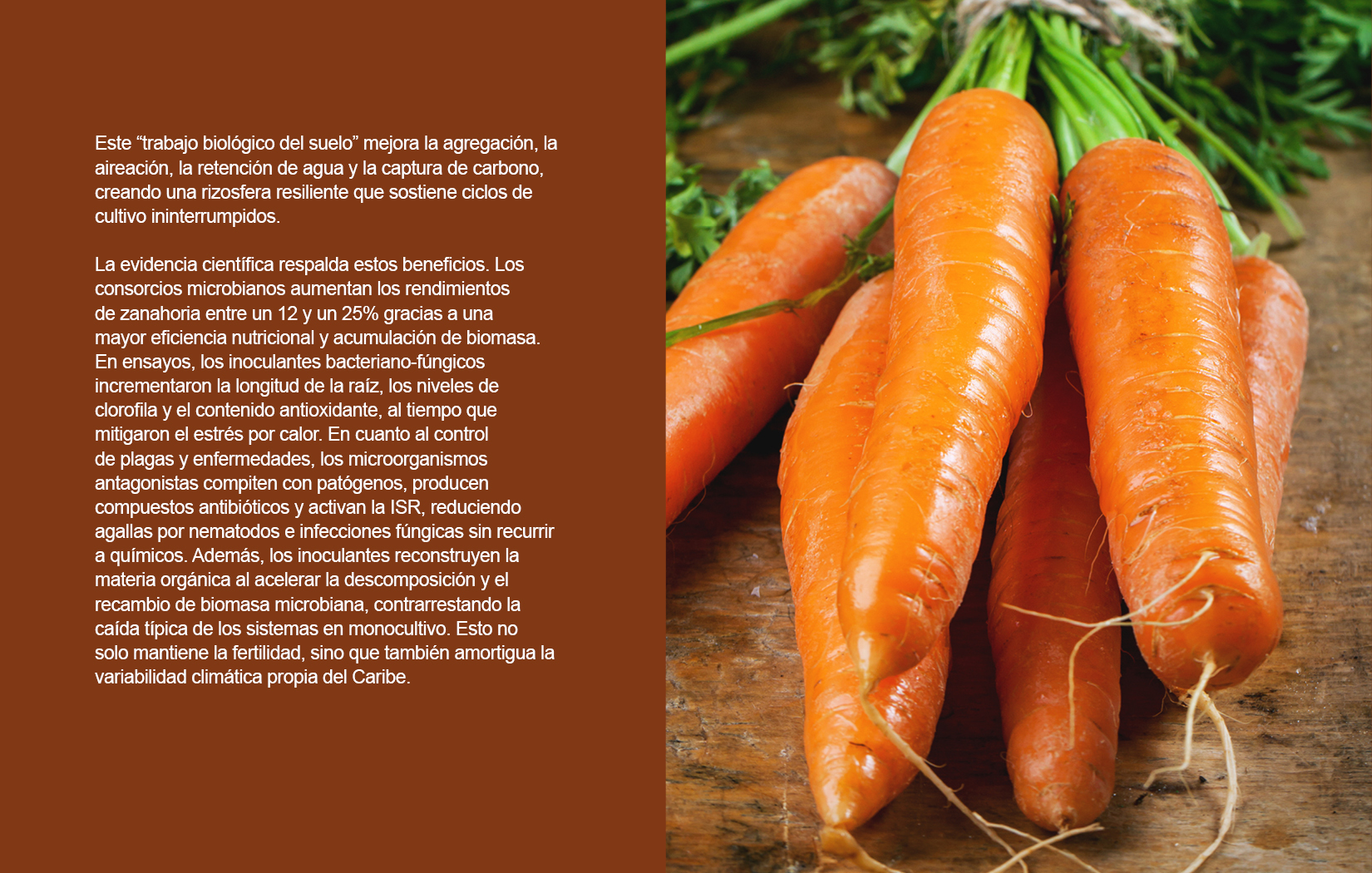 La evidencia científica respalda estos beneficios. Los consorcios microbianos aumentan los rendimientos de zanahoria entre un 12 y un 25% gracias a una mayor eficiencia nutricional y acumulación de biomasa. En ensayos, los inoculantes bacteriano-fúngicos incrementaron la longitud de la raíz, los niveles de clorofila y el contenido antioxidante, al tiempo que mitigaron el estrés por calor. En cuanto al control de plagas y enfermedades, los microorganismos antagonistas compiten con patógenos, producen compuestos antibióticos y activan la ISR, reduciendo agallas por nematodos e infecciones fúngicas sin recurrir a químicos. Además, los inoculantes reconstruyen la materia orgánica al acelerar la descomposición y el recambio de biomasa microbiana, contrarrestando la caída típica de los sistemas en monocultivo. Esto no solo mantiene la fertilidad, sino que también amortigua la variabilidad climática propia del Caribe.