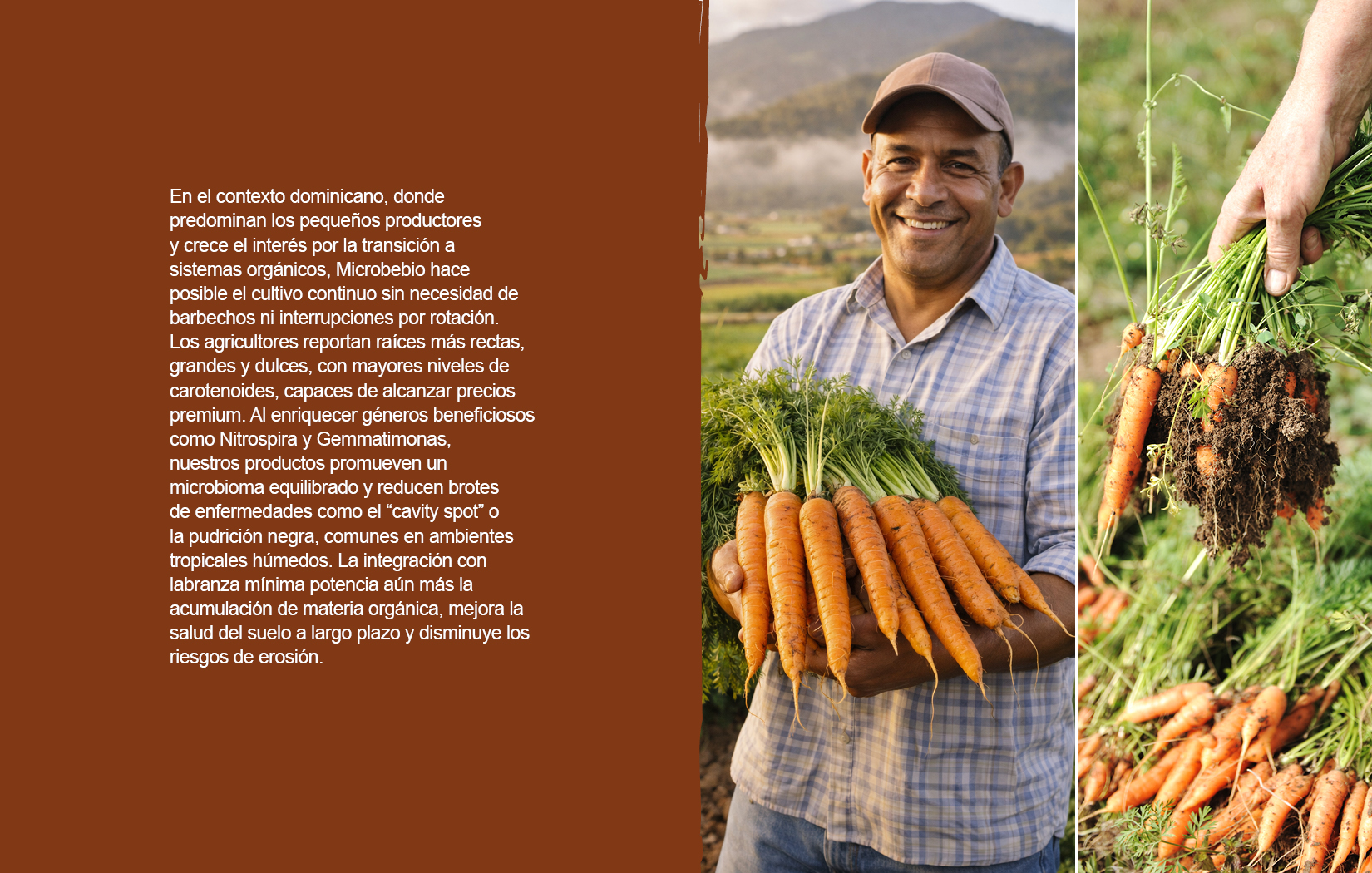 En el contexto dominicano, donde predominan los pequeños productores y crece el interés por la transición a sistemas orgánicos, Microbebio hace posible el cultivo continuo sin necesidad de barbechos ni interrupciones por rotación. Los agricultores reportan raíces más rectas, grandes y dulces, con mayores niveles de carotenoides, capaces de alcanzar precios premium. Al enriquecer géneros beneficiosos como Nitrospira y Gemmatimonas, nuestros productos promueven un microbioma equilibrado y reducen brotes de enfermedades como el “cavity spot” o la pudrición negra, comunes en ambientes tropicales húmedos. La integración con labranza mínima potencia aún más la acumulación de materia orgánica, mejora la salud del suelo a largo plazo y disminuye los riesgos de erosión.