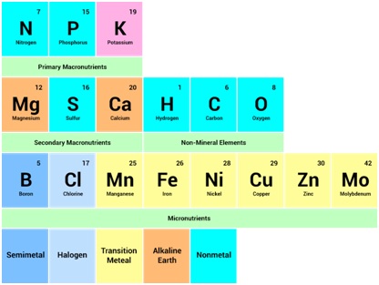 The Micronutrients: Boron, Chlorine, Manganese, Iron, Nickel, Copper, Zinc, and Molybdenum…. These plant food elements are used in very small amounts, but they are just as important to plant development and profitable crop production as the major nutrients. Especially since they work “behind the scenes” as activators of many important plant functions.