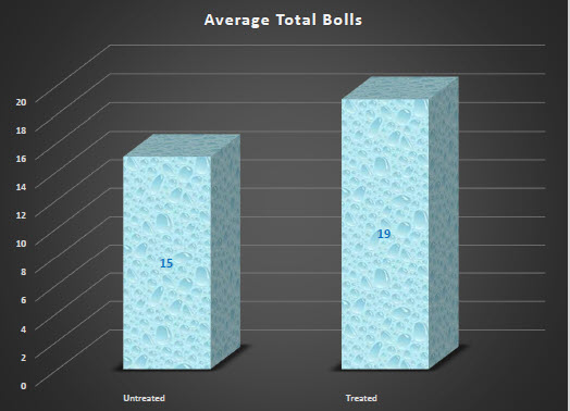Average total bolls per plant by treatment and the average percentage of the treated plants when compared to the untreated plants.