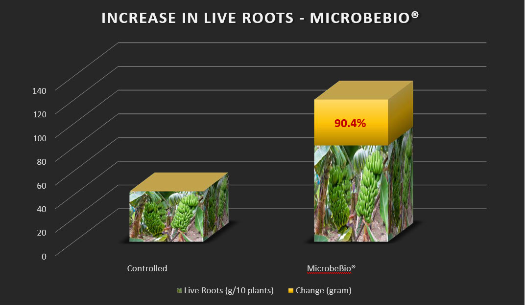 Conclusions                 :    The results from this trial revealed that by using MicrobeBio® products, banana farmers can see considerably great improvement up to 90.4% (~ 38.7 gram per 10 plants) in the Live Roots of the banana field.