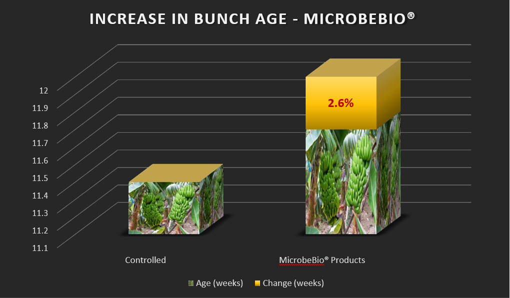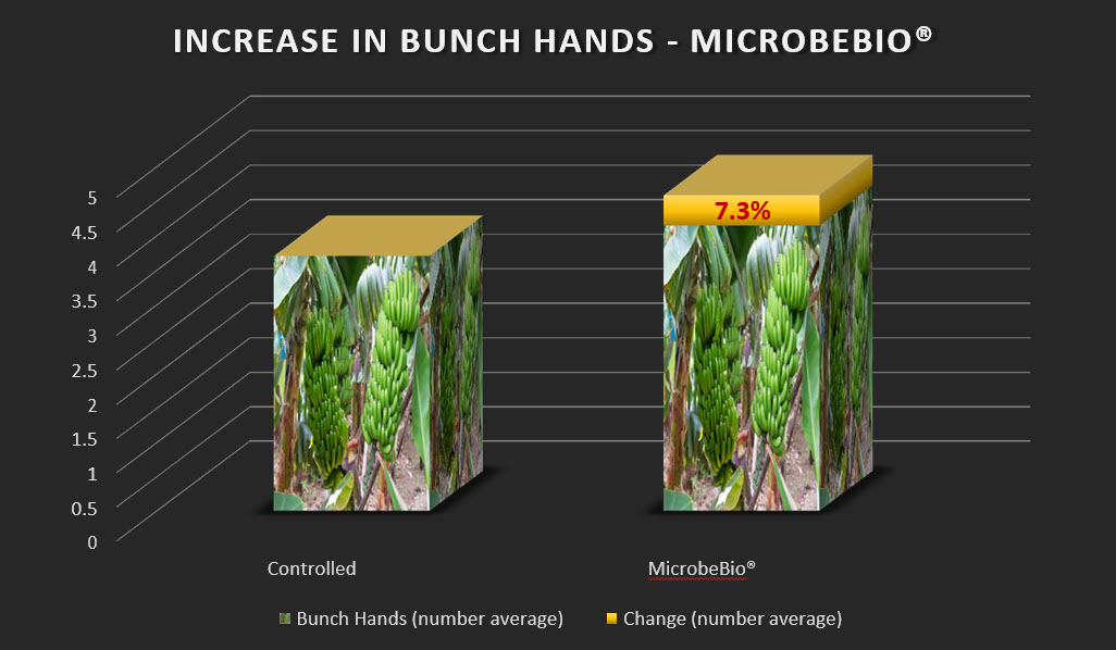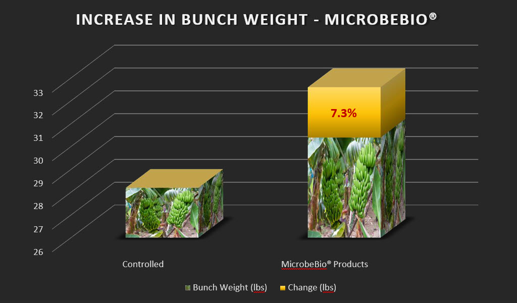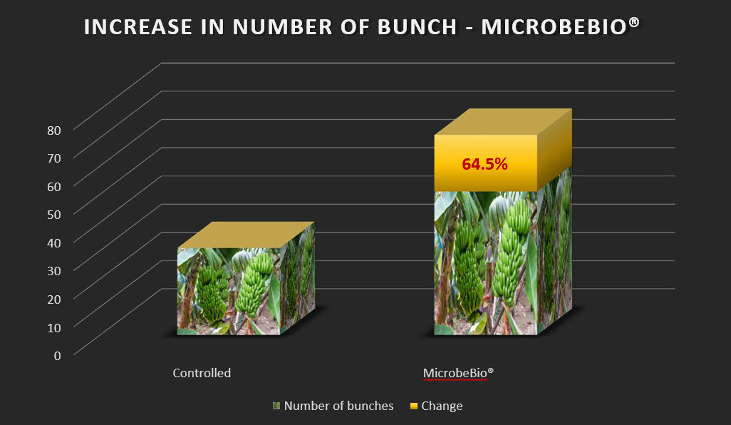 Conclusions                 :    The results from this trial revealed that by using MicrobeBio® products, banana farmers can see considerably great improvement of increasing in total bunch number monthly 64.5% and total bunch weight monthly 7.3%.
