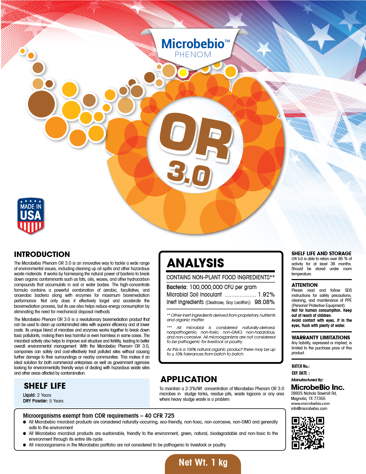 Microbebio Phenom OR 3.0 es una forma innovadora de abordar una amplia gama de problemas ambientales, incluida la limpieza de derrames de petróleo y otros materiales peligrosos. Funciona aprovechando el poder natural de las bacterias para descomponer contaminantes orgánicos como grasas, aceites, ceras y otros compuestos hidrocarburados que se acumulan en el suelo o en cuerpos de agua. Su fórmula de alta concentración contiene una combinación poderosa de bacterias aerobias, facultativas y anaerobias, junto con enzimas para un rendimiento máximo en biorremediación. No solo actúa de manera efectiva para acelerar el proceso de biorremediación, sino que también ayuda a reducir el consumo de energía al eliminar la necesidad de métodos de eliminación mecánica.