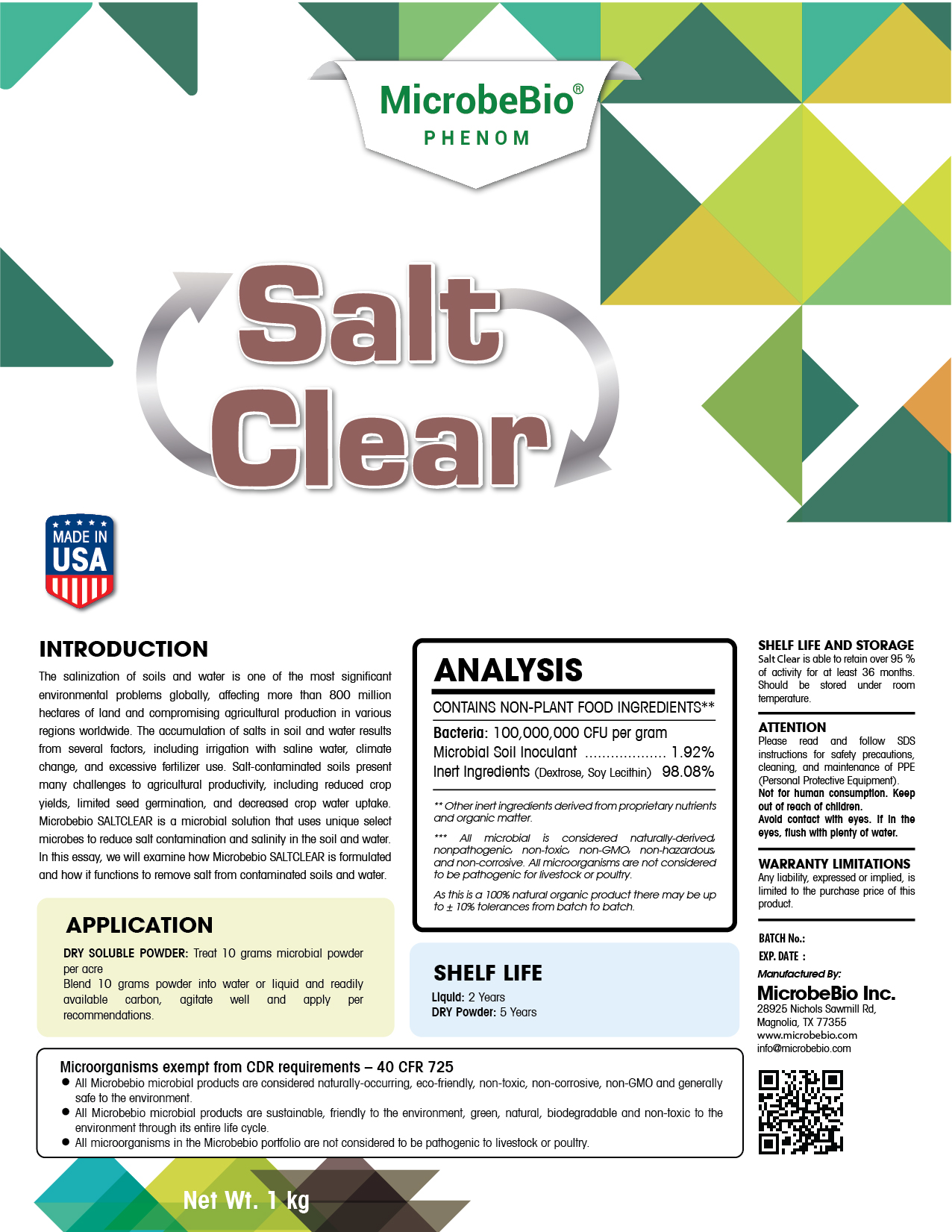 Microbebio SALT CLEAR reduce la concentración de sal y la salinidad en el suelo y el agua. El producto funciona mediante varios mecanismos, incluidos la bioremediación, la descomposición de compuestos orgánicos, la mejora de la calidad de los cultivos y la absorción de nutrientes, la mejora de la fotosíntesis y el aumento del rendimiento.