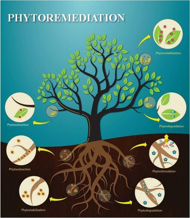 - Some element ions of the groups IIB, VA and VIA of the periodic table (specifically Hg, Se and As) are absorbed by the roots, converted into non-toxic forms, and then released into the atmosphere.