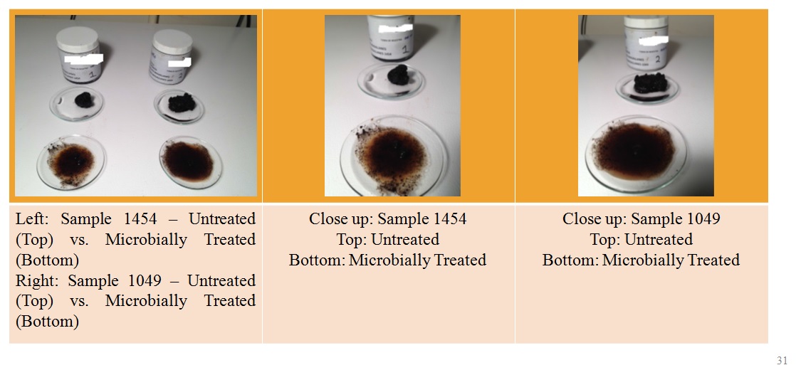 Throughout the 6 day period, starting on day 1, there was a significant increase in the treated oil samples versus untreated, including microbial mass, and color (which darkened). The results showed that carbons from the hydrocarbon chains (as measured by globule formations) were being utilized and metabolized by the microbes, with a resultant smaller hydrocarbon chains and more early moveable oil.