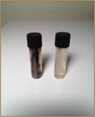 Here we see an H₂S side-by-side comparison between 2 heavy oil samples, one treated with microbes and the other untreated, with the black color coming from the formation of H₂S due to the sulfate reducing bacteria (SRB) in the hydrocarbon substrate.