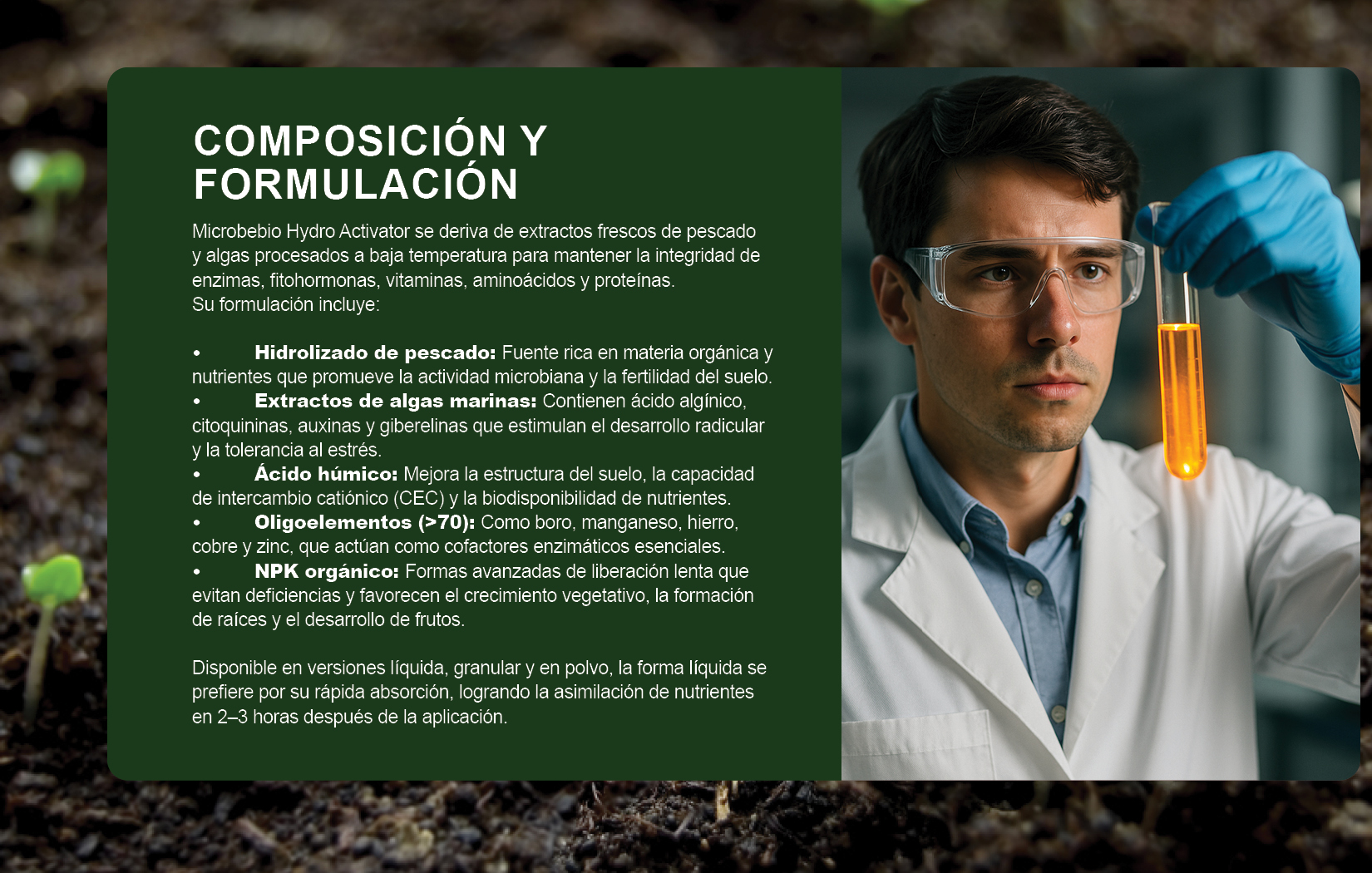 Microbebio Hydro Activator es un bioestimulante orgánico innovador formulado a partir de hidrolizado fresco de pescado, extractos de algas marinas y ácido húmico, enriquecido con más de 70 oligoelementos y formas orgánicas avanzadas de nitrógeno (N), fósforo (P) y potasio (K) (NPK).