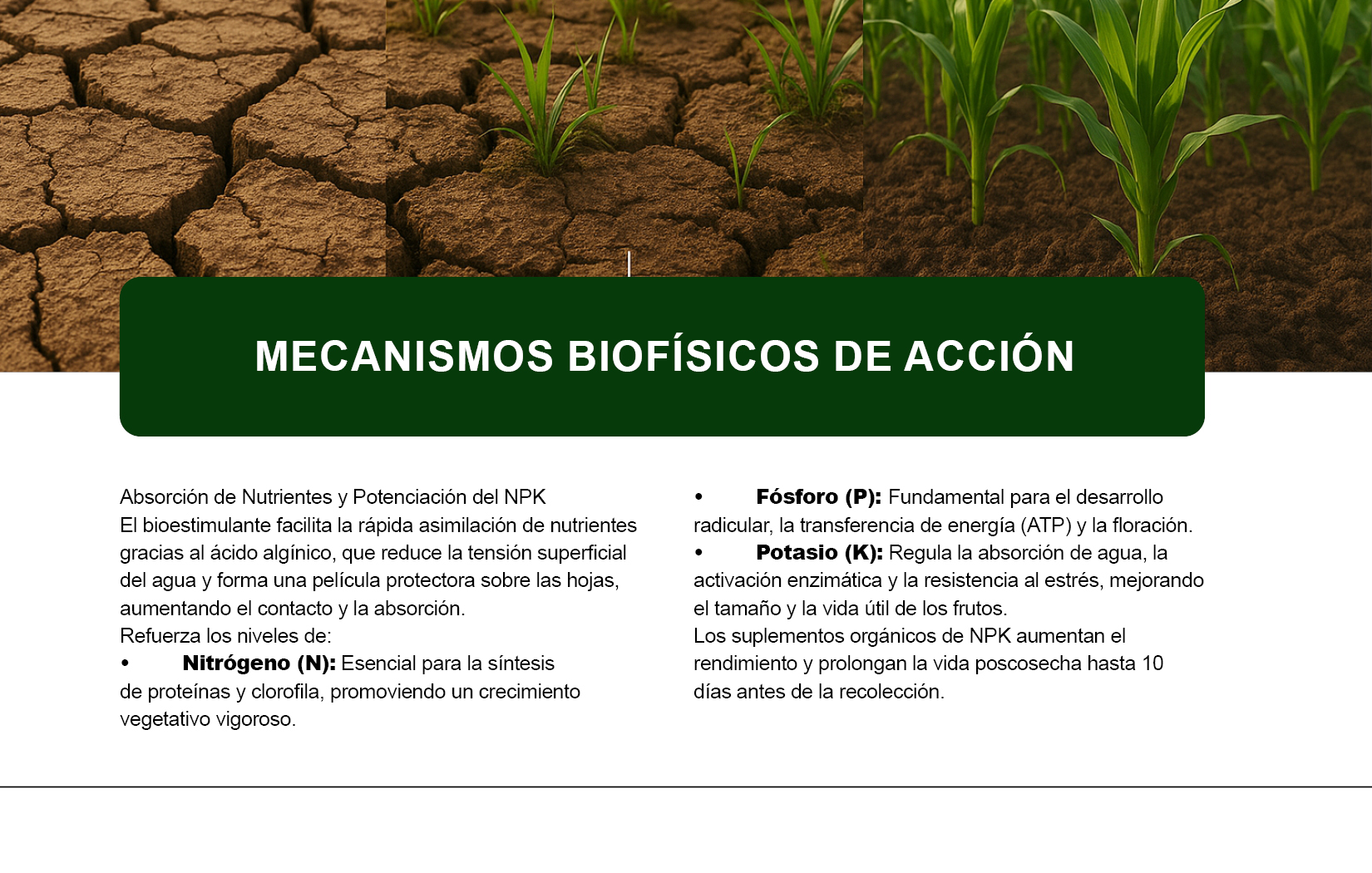 El bioestimulante facilita la rápida asimilación de nutrientes gracias al ácido algínico, que reduce la tensión superficial del agua y forma una película protectora sobre las hojas, aumentando el contacto y la absorción.