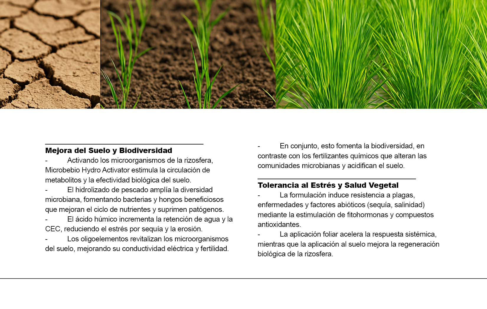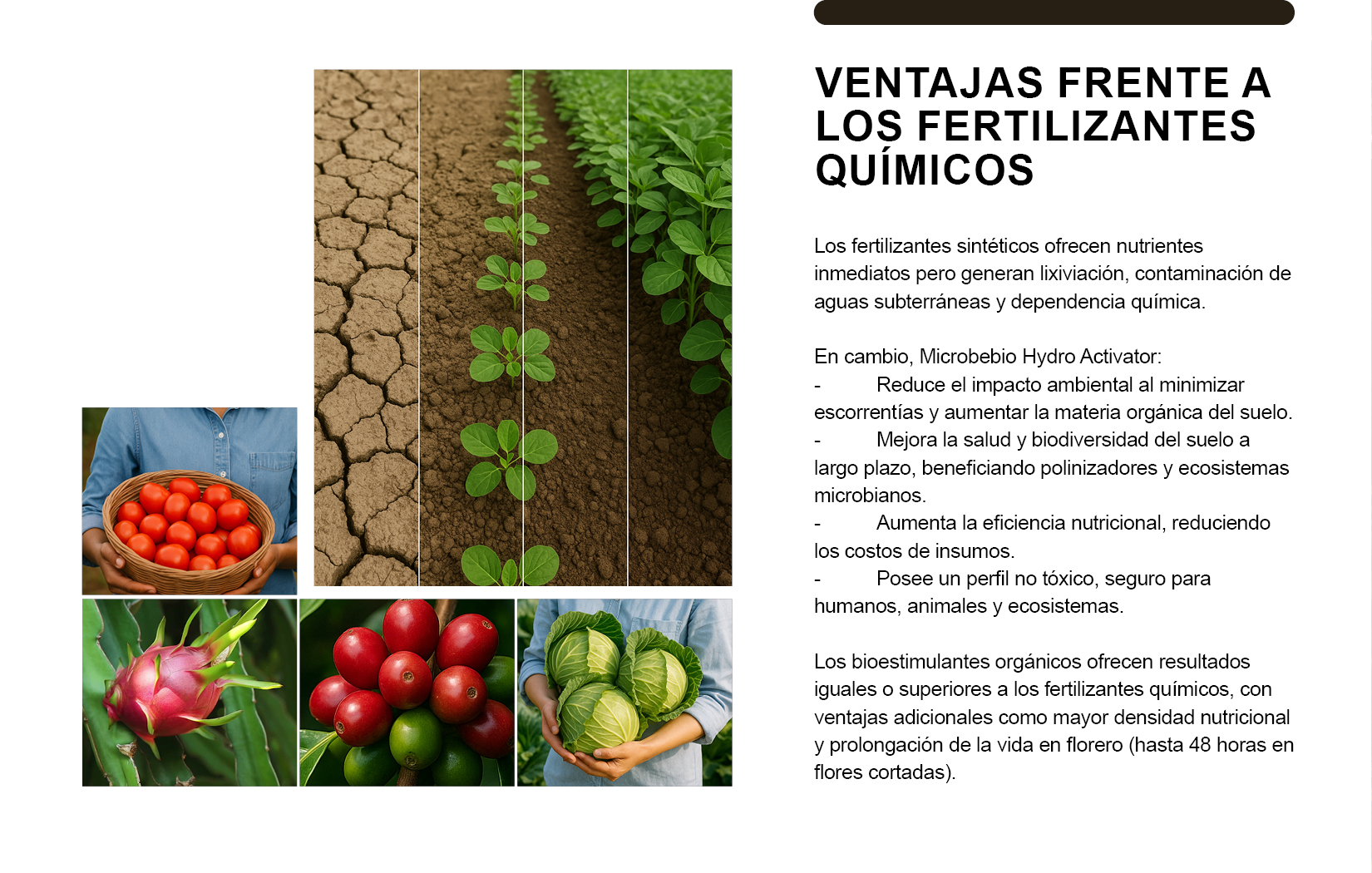 Microbebio Hydro Activator representa un bioestimulante sostenible y eficaz que supera a las alternativas químicas en la promoción de la salud vegetal, el rendimiento y la protección ambiental.